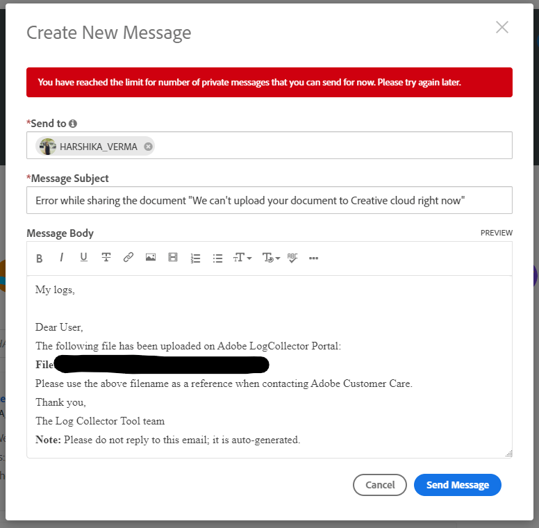 If this reply has answered your question or solved your issue, please mark this question as answered. Adobe sign was unable to create your agreement because the document could not be thumbnailed. environment adobe sign send screen All accounts have a maximum file size they can upload, and this error indicates when a file is over that limit. When user b upload the file locally, no error occurs. Document is password protected, please remove password protection before using the document.